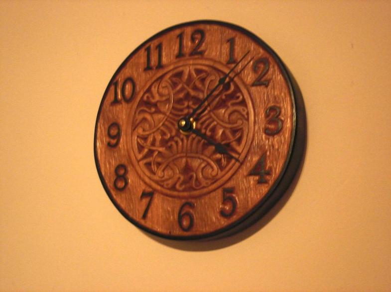 wall clock with carved Celtic background, cherry