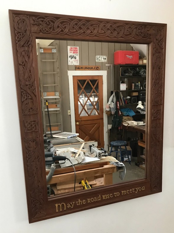 Black walnut mirror frame, with Celtic dog design on the sides and snake on top.